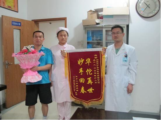 “我爸爸执意要我们送来这面锦旗,是你们医院挽救了他的生命,让他重获新生。”送来锦旗的老人的子女说。