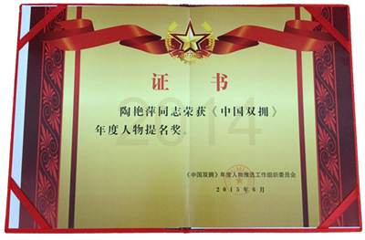 2014《中国双拥》年度人物推选活动历时3个多月,通过组织推选、社会举荐、网络推选等形式,从全国各地数百名对双拥工作作出突出贡献的候选人中,最终评选出2014《中国双拥》年度人物15名,提名奖48名,入围奖43名,陶艳萍凭借40多年来对拥军爱兵工作的满腔热情和无私付出名列其中。