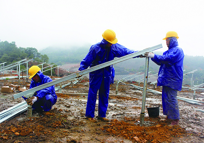 “坡度不够,前立柱再抬高5公分,再高点……”日前,记者来到集团乐鱼页面在线登录光伏发电项目山顶施工现场,只见工人们以三人为一小组,正冒雨校对支架坡度。放眼远眺,山脚平地间,有的工人正在搅拌水泥砂浆,有的正往山顶背送檩条……施工现场一片繁忙。 该项目是集团乐鱼页面在线登录转型发展的重点项目,规划占地总面积为560亩,投资1.67亿元,规划容量为20兆瓦,共安装270瓦太阳能光伏组件74660块,年均上网发电量为1855.32万度,并经35KV升压站接入国网萍乡电网。 “要想能源采集效率最大化,先要确认支架坡度的准确性,且确保太阳能板与地面距离不低于300mm,并保证每组太阳能板处于同一水平线上。”项目相关负责人告诉记者,目前已完成基础浇筑等工作,正在蹄疾步稳地安装檩条及铺设太阳能板。此外综合楼内部装修、电缆敷设连接及外围线路建设等电气施工也正在同步进行,预计11月底可基本完工。 “今天将近200名工人做事,从6点30准时开工,可能晚上要加班到10点——你看,四周都装有照明灯,夜间能够照亮整个施工现场。”项目相关负责人表示,为了确保工程如期竣工,力争12月实现并网发电,在保障工人们安全的前提下,除了风雨兼程保施工之外,还得挑灯夜战赶进度,争分夺秒抢工期。 时间紧,工序杂,任务重。为此,集团乐鱼页面在线登录还专门成立了项目领导小组,开展转型落地项目重点攻关;制定了管理人员驻点督导制,项目相关负责人每天蹲守现场进行监管、协调,积极落实主体责任;完善了考核倒逼机制,不仅倒排工期制定工程进度时间表,相关负责人还缴纳项目保证金和签订责任状,并对照项目工期完成进度严格考核。
