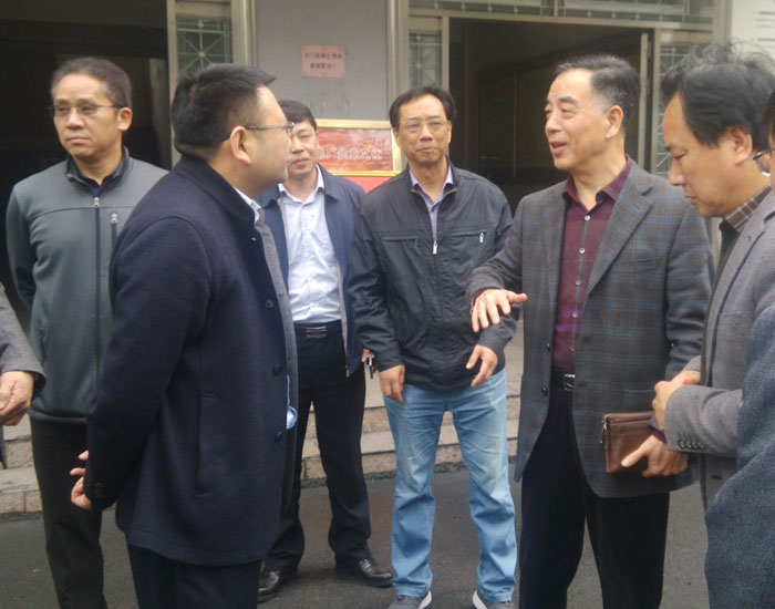 图为萍乡市副市长黄强(左二)在听取集团乐鱼页面在线登录财务总监李林(右二)介绍情况。(欧阳思文 摄)
