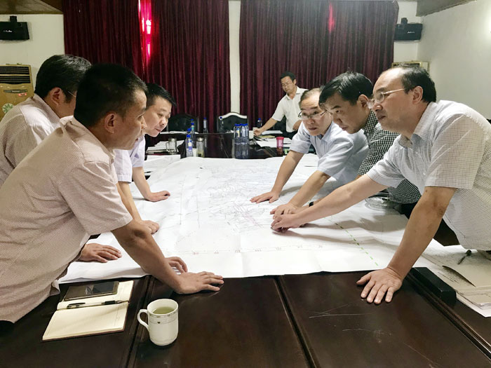 图为林绍华与刘伏生等正在认真查看生产图纸。