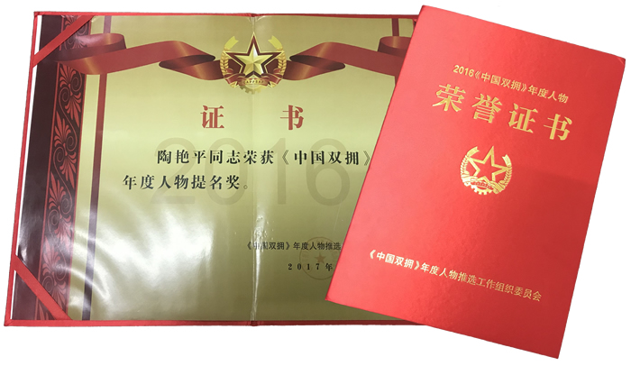 继2015年荣获《中国双拥》年度人物提名奖后,近日,“兵妈妈”陶艳萍又收到一本由萍乡市双拥办领导亲自送来的荣誉证书,时隔一年,她再一次荣获《中国双拥》年度人物提名奖。 《中国双拥》年度人物均为利用自身力量在爱国拥军工作中,特别是为深化军民融合发展等作出突出贡献的模范典型。尽管年事已高,去年还曾做了心脏手术,但自1968年第一次走进军营直到现在,49载,陶艳萍从不曾忘初心,拥军爱兵脚步从不曾停歇。她一次次走进军营,无私帮助远离父母的兵娃娃,为他们送去慰问品、宣讲革命故事,为他们排忧解难、带去欢乐,甚至远赴珠海慰问消防官兵。近年来,她还经常带领一支文艺小分队,穿梭于各军营,为官兵慰问演出近百场。 49年如一日的坚持,写就了浓浓的军民鱼水情。《人民日报》、《江西日报》、《萍乡日报》、《江西卫视》和《中国双拥》杂志等媒体相继对她进行了报道。各种荣誉也纷至沓来,多次被评为 “最美萍乡人”,曾入围“中国好人榜”,获得《中国双拥》年度人物提名奖、全国全省双拥先进个人和萍乡市道德模范等荣誉称号。一本本鲜红的荣誉证书,就是陶妈妈大爱无私的结晶。 “不忘初心、继续前进、强军有我!”这位76岁高龄的老人字字铿锵。