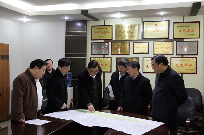 图为曾昭和(中)在安源煤矿查看矿井扩深平面图。周建生 摄