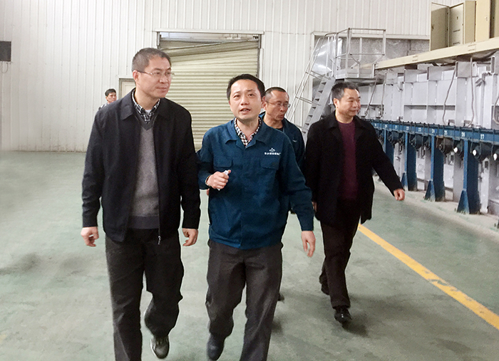 图为周犇(左一)在浮法玻璃厂联合车间实地检查。