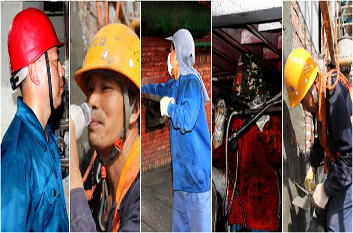 持续的高温,让初夏也显得异常炎热。动辄36℃、37℃的气温,直逼得人想时时刻刻坐在空调下。但在萍矿集团各单位,却有不少职工,坚守在烈日下、窑炉前,经受高温“烤验”,体现担当作为。 今天,让我们用镜头追随他们,记录他们的付出,感受他们的敬业,并将大写的“赞”送给他们! 原定11月31日前完成的萍安钢环保项目土建安装工程,因甲方需要,需提前至8月31日完成,任务紧,工期重!为如期完工,从进场施工至今,萍矿工程乐鱼页面在线登录30名施工人员日日“钉”在工地,加班加点加油干。持续高温,让工地地表温度高达50℃!但烈日炎炎挡不住他们施工的热情,尽管衣服一次次被汗水湿透,5L装的水一天喝两瓶都不够,他们没有退缩,每天争分夺秒,战高温、斗酷暑,比质量、比速度,因为他们深知:重任在肩,唯有担当! 炉内温度高达1600℃,炉外温度也高达80℃,从炉前路过,脸上的灼热感就象太阳挂在头顶与你同行。十几米的行程,汗水会让你全身湿透。在浮法玻璃厂,熔化工经常要在这样的环境中检查燃烧器和投料情况,以保证良好的燃烧工况,满足生产工艺要求。检查燃烧器时,他们必须穿上厚厚的防护服,戴上防护帽和手套。为确保安全,他们每次必须行动迅速、判断精准,在10分钟内完成操作,否则,长时间的高温会对身体造成伤害。而这样的高温“烤验”,对他们来说已是家常便饭。他们被炉火映红的眼睛,透着钢铁般的坚毅! 当锅炉门一打开,扑面而来的热浪让人喘不过气来,虽只有一瞬间,但温度却高达80℃。在安源发电厂,这种情况不是偶尔才有,而是经常要经历。锅炉的正常运行,对正常发电至关重要。因为工作流程的需要,该厂锅炉运行车间的员工每天就是在这四季如夏的环境中,穿着厚厚的工作服,忍着灼人的热浪,定时定点对锅炉、煤斗、皮带进行维护,保生产,保安全,衣服是湿了又干、干了又湿。但他们任劳任怨,一心只为确保锅炉的正常运行。