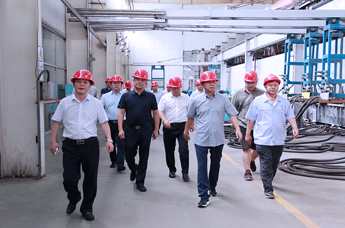 杨雪岗(前排右二)一行到浮法玻璃厂考察调研。 摄影 周建生