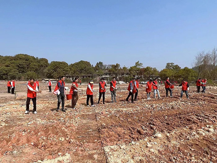 上午,党员们身穿红色马甲、胸戴金色党徽,早早来到现场,有序领取树苗和工具,投入到“植树大军”中。他们有的挥锹铲土、扶苗填坑,有的踩实压紧、提桶浇水,现场一派繁忙有序、热火朝天的劳动景象。在汗水的浇灌下,松柏、柚子、桃树、桑树等100余棵树苗迎风而立,充满生机和希望。种完树苗后,党员们还给地里撒上花籽,准备给厂区的荒地披上彩装。经过一上午的挥汗奋战,望着笔直整齐的树木,虽然疲惫不堪,但志愿者们都露出了欣慰的笑容。