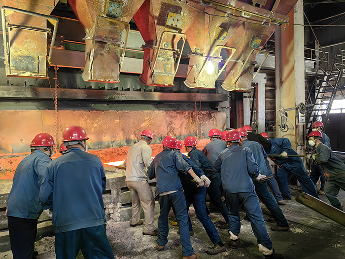 随着一声令下,该厂广大党员骨干迅速投入到这一攻坚战役中。熔化工关闭一侧下料口,并停止退出投料机后,大家迅速清理池壁上沿杂物、结块,并及时调整投料机前端高度,钳工则立即组织加装焊接推料板。随后,大家便投入了最为辛苦、最为关键的人工投料环节。只见大家10人一组,分工明确,首先打开铁钩,随后关闭下料口,立即通过提前准备好的投料车,实施人工反复推料。电焊工则在一旁紧张打磨投料机舌板,现场焊花四溅。尽管炉外温度高达100余摄氏度,可是大家的工作热情、干劲却丝毫未减,不一会儿,只见大家个个汗流浃背、衣襟湿透,脸上都留下了硕大的汗珠,可是他们顾不上擦拭脸上的汗水,也早已忘记湿透的衣襟,心中想的都是要安全、高效完成攻坚任务。