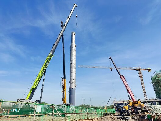 此次进场的1#、2#蒸氨塔是化产工艺升级的核心装置。作为国内同类型产品中的“重量级选手”,其29.8米高的设计,不仅可提升单位时间处理量,更通过优化塔内填料结构,使氨回收效率与蒸汽降耗能力大幅度提升,充分体现了“高效、节能、环保”的设计理念。