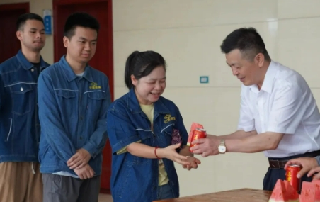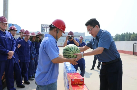 漆云飞则来到焦化项目现场,将精心准备的清凉物资递到施工人员手中,关切询问大家的工作时长、作息安排及防暑措施落实情况,叮嘱大家一定要注意劳逸结合,始终将安全摆在第一位。一句句贴心问候,让大家倍感温暖,纷纷表示将把关怀转化为动力,以更加饱满的热情投入工作,为项目建设贡献力量。