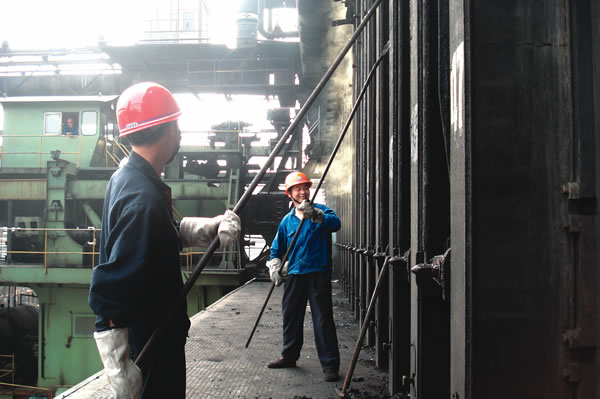炼焦车间党员骨干正在清理炉门焦油渣。(记者 光明 摄) | |