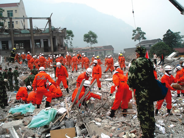 一个上坡处,人特别多,记者心里一动,这里似乎是个学校,是不是这次地震死了上千学生的北川中学?赶紧上去一看,挂着“四川省北川中学”校牌的学校内已经成了抢救人员的驻扎地和防疫药品发放地。教学楼的坍塌处成了一片废墟,四架大型起吊车垂下长长的钢索,几十名消防人员正在用镐,用铲,用钎小心地清理废墟上的混凝土块,就是在这个废墟下面,还有近千名学生被埋在下面。消防救援人员旁是一群着装印有“四川一建”字样的青年在清理废墟上的混凝土块,他们告诉记者,他们是今天上午到的,已经是第二批救援者了。目前这里救援的希望很小。记者在现场闻到了尸臭。废墟上到处是学生的课本、作业本、零散的鞋。有一名母亲不断在废墟的课本、作业本上翻找,嘴里木木地念道,孩子啊,你也不给妈妈留下一点什么。在这片石砾旁,有一堆清理挖掘时找到的学生的物品,有好几个手机,一个粉红色的看上去显然是女孩子的,一本崭新的《现代汉语词典》、手表、计算器等,可这些学生却永远埋在了地下。而这片废墟瓦砾前一点的旧教学楼,只是震裂了。后来记者采访一名死难学生的家长时,家长说,你看,老教学楼没有倒,倒的是新教学楼。据记者了解,这座坍塌的教学楼将建一地震教育基地。