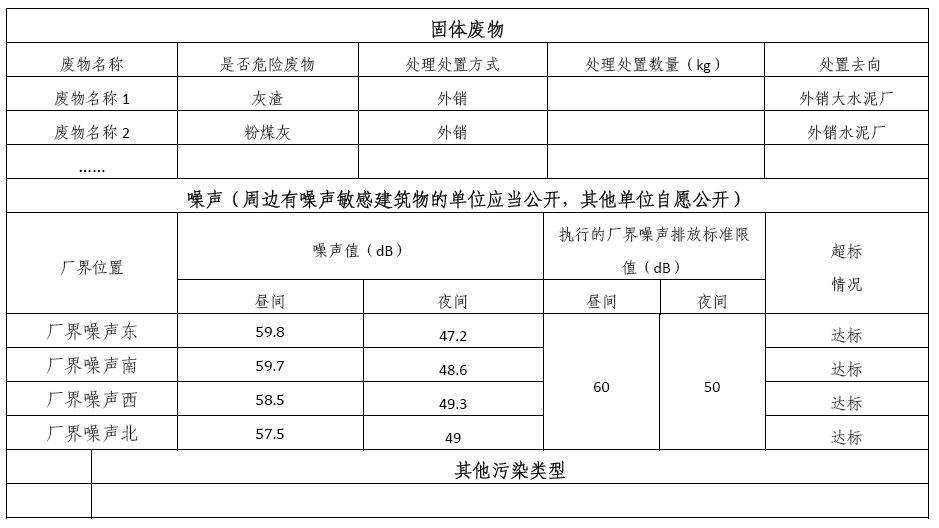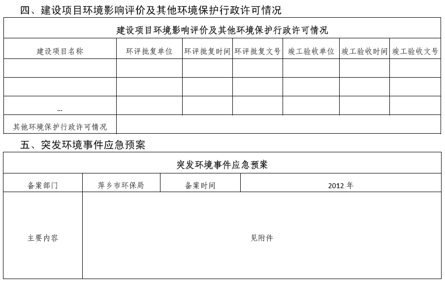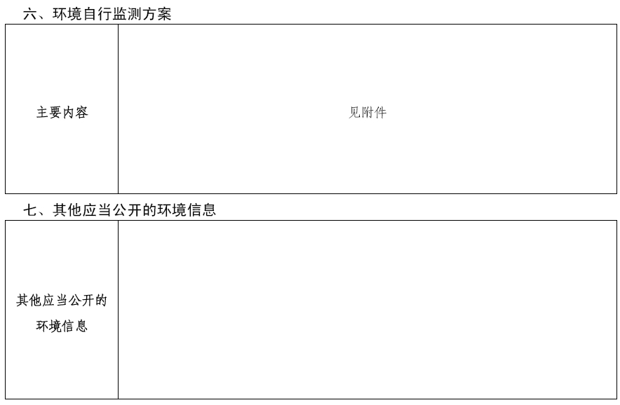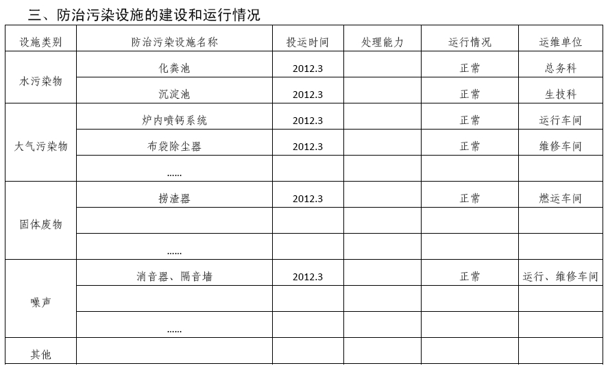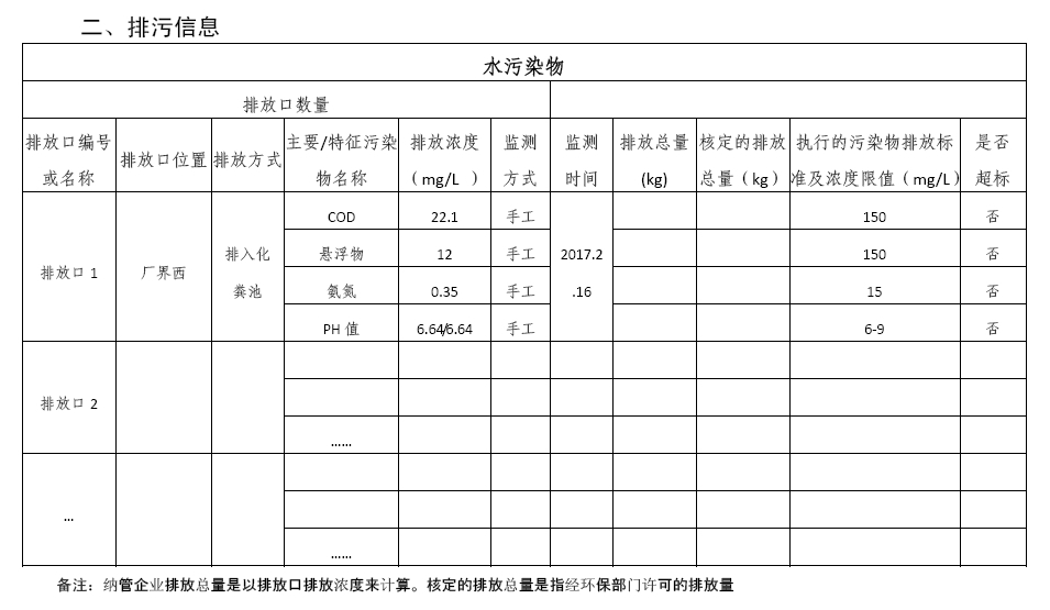 填表说明: 1、排放口编号或名称应与排污许可证上载明的一致,排放口位置为排放口所在的经纬度,排放方式为纳管或排环境,排放浓度为最近一次监测数值,监测方式为手工或自动,排放总量为最近一次的年度实际排放总量,核定的排放总量为排污许可证上载明的核定排放总量或环评批复上允许的排放总量。 2、污染源自动监控系统作为环境保护设施的组成部分,应在防治污染设施的建设和运行情况中予以公开,并在处理能力中填写监测指标。 3、企业事业单位环境信息涉及国家秘密、商业秘密或者个人隐私的,依法可以不公开,法律、法规另有规定的,从其规定。