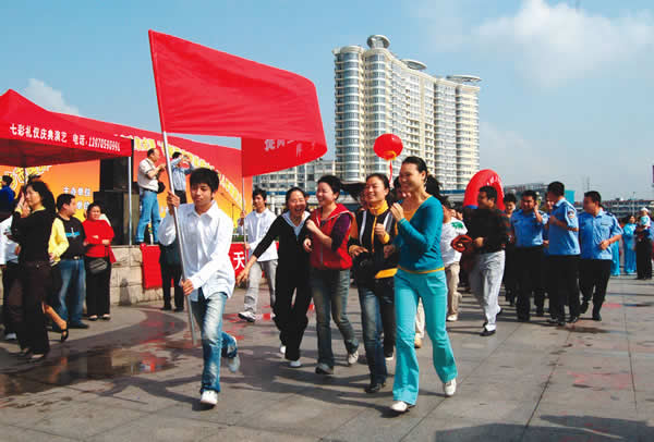 4月20日上午九点,秋收起义广场长廊舞台彩旗飘扬,上万名市民、运动员聚集在此,在1000名老人整齐和壮观的“八段锦”拳后,市委书记刘和萍宣布:萍乡市国庆60周年全民健身活动暨“争创国家园林城市”万人环城接力跑开始!起点处数百身着运动服的运动员在奥运火炬手的带领下,开始了万人环城接力跑活动。