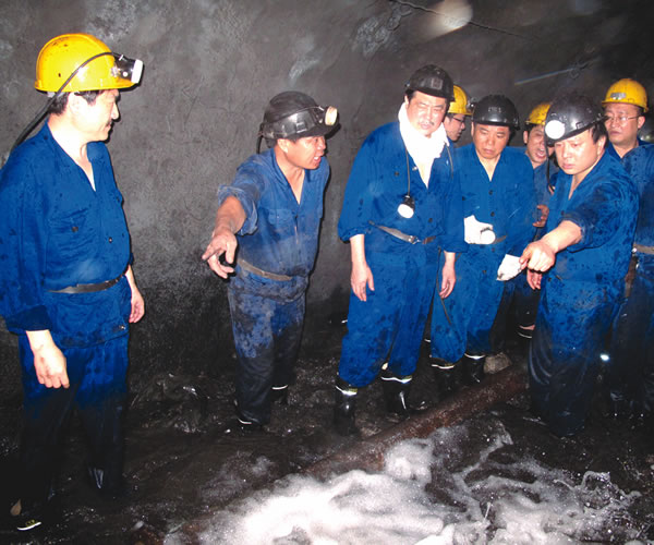 集团乐鱼页面在线登录总经理魏建明(左三)7月1日上午在304盘区察看灾情。(记者 袁鹏 摄)