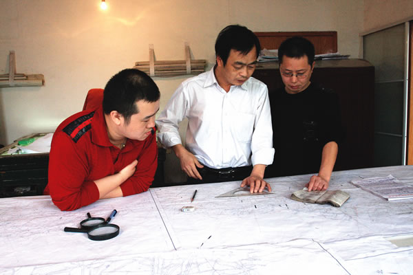 吴绍德(中)和技术人员在研究工作。(杨子申 摄)